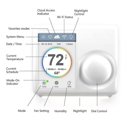 Termostaty působí jako nepřímé ovládací prvky pro přístup k systému HVAC (vytápění, větrání, klimatizace). Přístroj není přímo ohříván, ochlazován ani větrán. Řídí pouze relé nebo vysílá signál pro aktivaci systému. Nejdůležitější funkcí termostatu je zjištění teploty v místnosti a optimalizace denní teploty podle koncového uživatele. Celé rozhraní je velmi jednoduché a intuitivní. Můžeme řídit termostat z vestavěné přední části displeje. Po nainstalování aplikací, které jsou k dispozici v Obchodu Google Play (Android) a AppSore (iOS), budeme jej moci ovládat odkudkoliv prostřednictvím smartphonu (za předpokladu, že mají přístup k Internetu). Při návštěvě účtu account.ferguson.com.pl a přihlášení k stejnému účtu jako v termostatu získáváme možnost ovládat zařízení prostřednictvím webového prohlížeče. Termostat umožňuje řídit systémy jako topení, klimatizace nebo větrání.