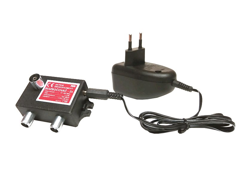 ◆ Aktivní rozbočovač pro DVB-T/T2, 2x výstup, připojení do účastnické zásuvky + zdroj, zesílení >4dB.