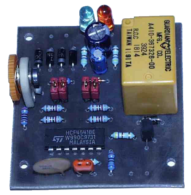 s přepínacím kontaktem. Indikace zapnutí LED diodou. Napájení 8V – 10Vst. nebo 12Vss. Odběr proudu 80mA. Časový interval 15s – 2 hod. Plošný spoj 6 x 5 cm.