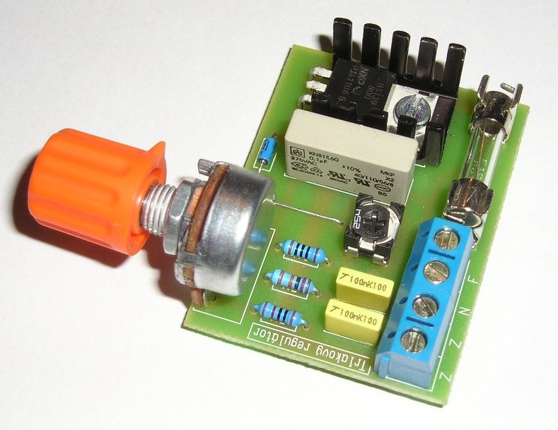 Velice oblíbený regulátor žárovek, topení a motorů s uhlíky. Regulátor může regulovat i transformátor na primáru, vhodné pro nabíječky. Stavebnice rozhodně není vhodná pro začátečníky a nezkušené. Jedná se o zařízení, které je přímo spojené se síťovým napětím. Toto napětí je životu nebezpečné a proto je potřeba velké opatrnosti při sestavování a provozování tohoto zařízení. Regulační rozsah je 0 - 100%. Napájecí napětí je ze sítě 230V/50Hz. Příkon zátěže max. 2,7kW. Plošný spoj 4,9 x 3,7 cm.