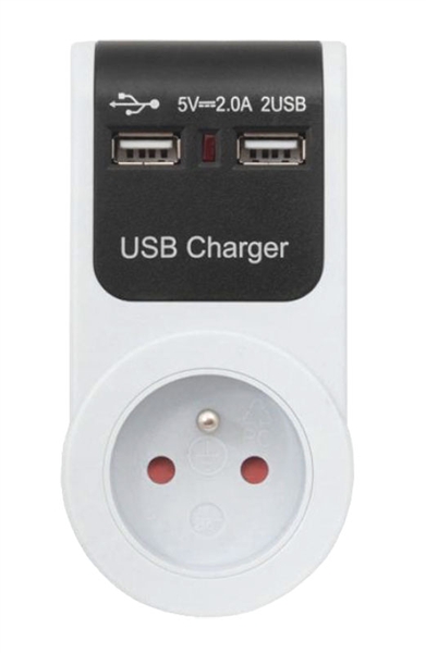 ◆ Adaptér USB 230V/5V/2x1A + zásuvka 230V průchozí.