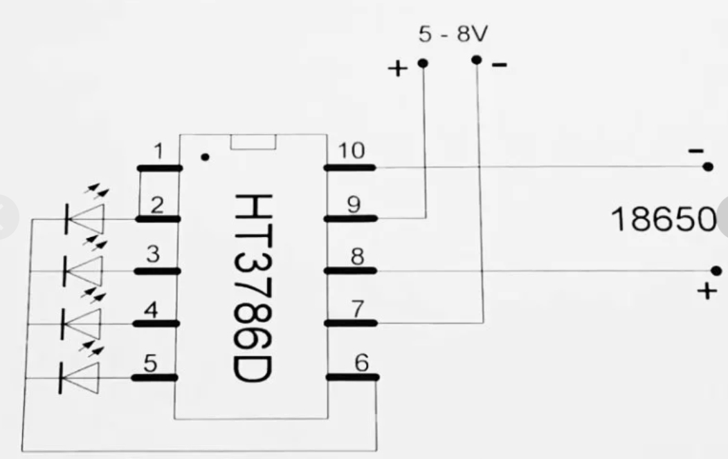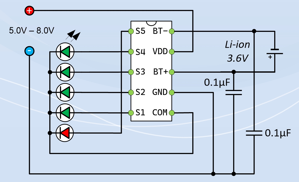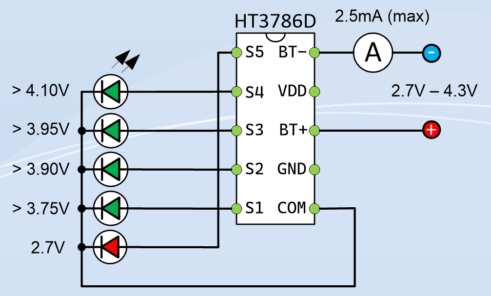 - čip je schopen určit polaritu baterie (pokud baterii položíte vzhůru nohama, vše bude fungovat jako obvykle).