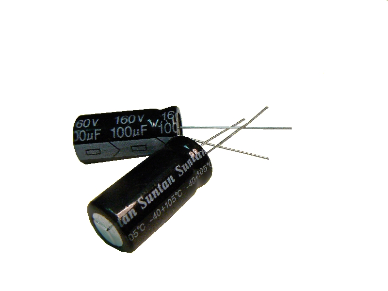 ◆ Elektrolytický kondenzátor 100uF/160V 105°C, rozměry: 12.5x25mm.