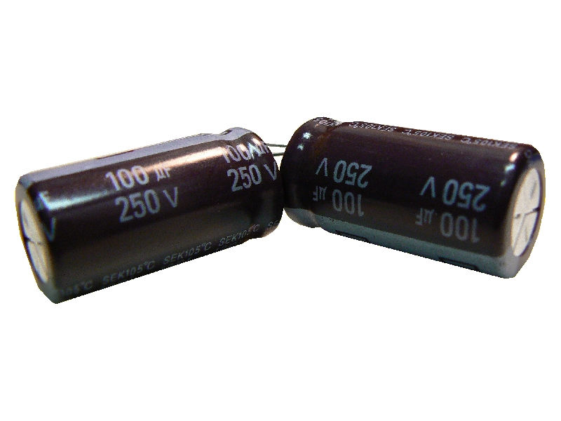 ◆ Elektrolytický kondenzátor 100uF/250V 105°C, rozměry: 16x32mm.
