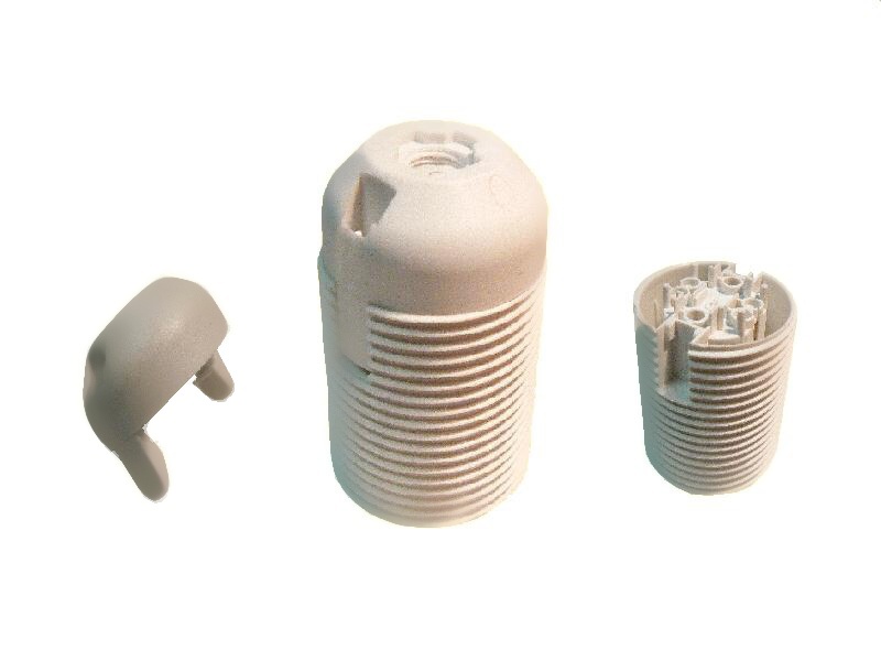 ◆ Objímka (umělá hmota) s vnějším závitem. Závit E27.